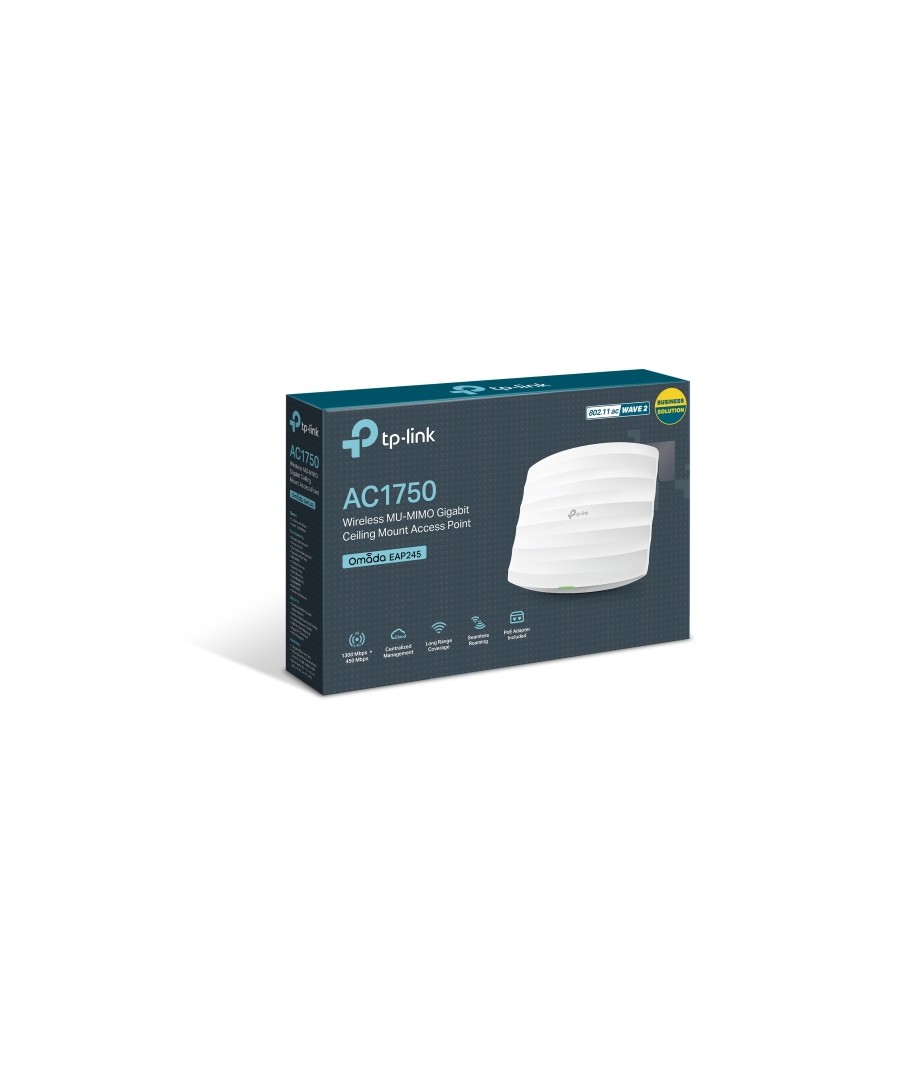 | Contenido del Paquete | • Punto de acceso de montaje en techo Gigabit MU-MIMO inalámbrico AC1750 EAP245 • Adaptador PoE pasivo Gigabit • Cable de alimentación • Kits de montaje • Guía de instalación |