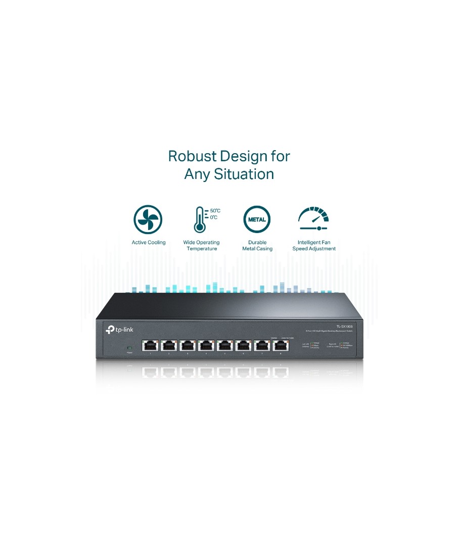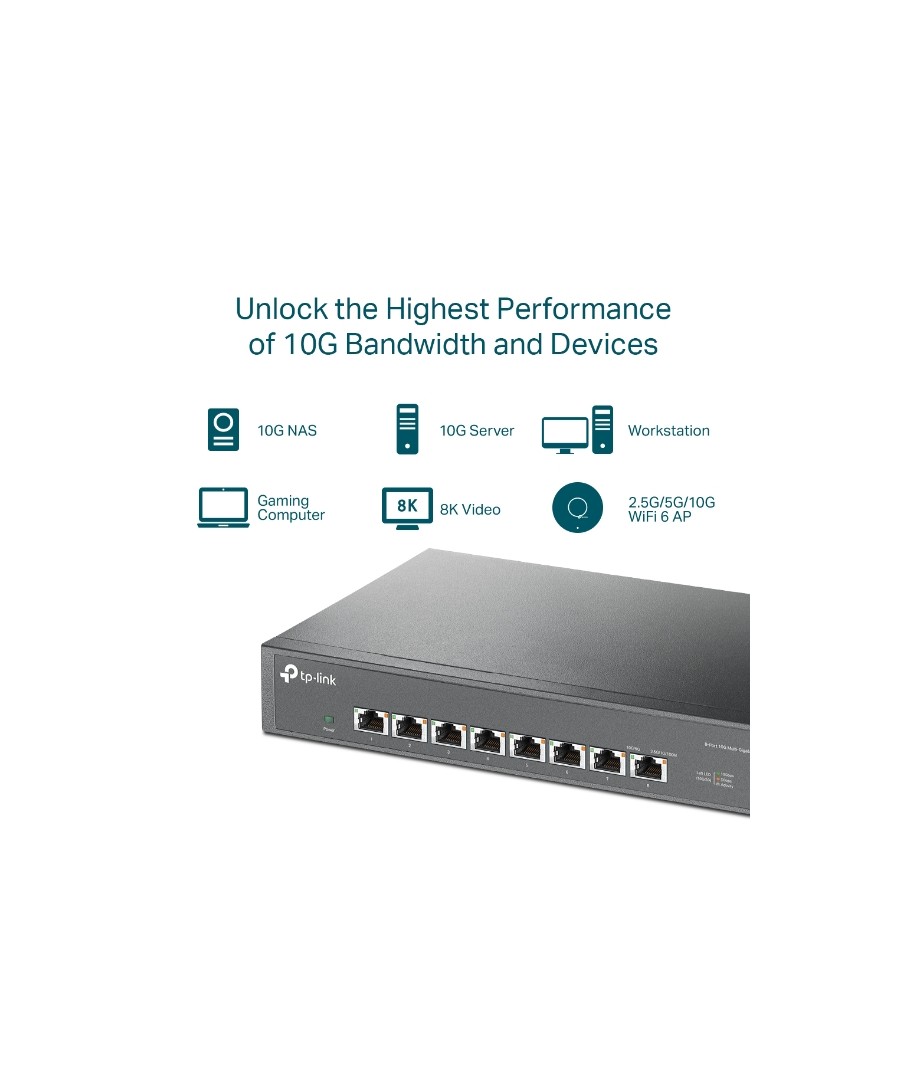 - Ocho puertos de 10 Gbps . Los 8 puertos Multi Giga desbloquean el rendimiento más alto de su ancho de banda y dispositivos de 10G/Multi-Gig, y brindan hasta 160 Gbps de capacidad de conmutación.