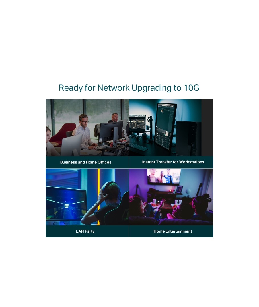 - Conexiones ultrarrápidas . Proporciona conexiones ultrarrápidas a NAS 10G, servidor, adaptador/NIC PCIe 10G, computadora de juegos, WiFi 6 AP 2.5G/5G/10G, video 8K y más.